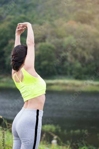 Relaxed woman breathing fresh air raising arms.