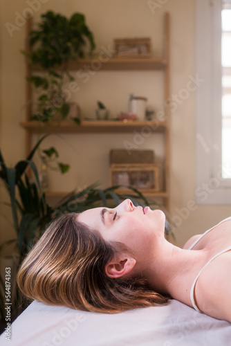 Relaxed woman lying on stretcher at spa