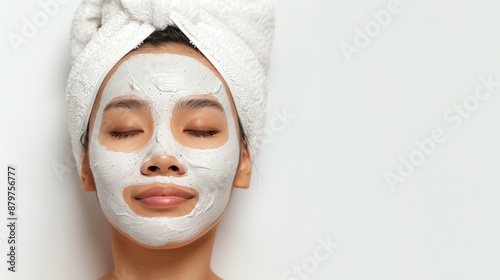 Relaxed woman with a towel on her head and a white facial mask, enjoying a spa day at home or a beauty treatment in a wellness center.