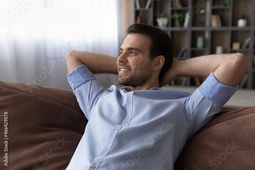 Relaxed young man lying on comfortable sofa with folded hands behind head, looking in distance daydreaming visualizing future, enjoying peaceful carefree leisure weekend moment alone in own home.