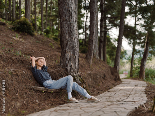 Relaxed young woman enjoying nature, sitting on a bench under a tree, surrounded by a tranquil forest path Peaceful and serene outdoor lifestyle concept