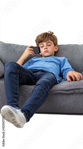 Relaxed young young Z generation lying on a sofa with a mobile phone isolated on white background