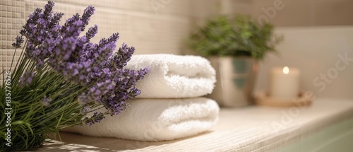 Relaxing Bathroom Decor with Towels and Lavender.