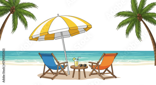 Relaxing beach scene with lounge chairs, a cocktail and swaying palm trees creating a serene