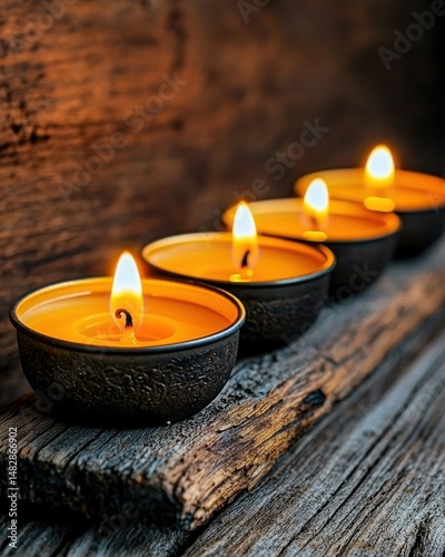 [Relaxing Candle Arrangement for Meditation] Cozy Candle Scene: Warm Ambiance with Lit Candles on Wooden Surface