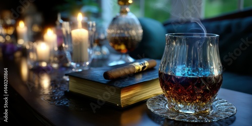 Relaxing evening with a glass of whiskey, a cigar, and candles creating a cozy ambiance