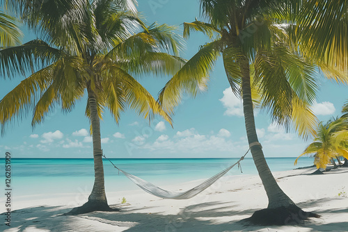 Relaxing hammock strung between palm trees on a tranquil beach during sunny daytime