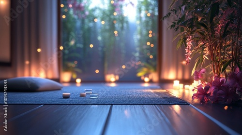 Relaxing indoor space with candles and flowers creating a serene atmosphere in the evening