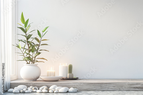 Relaxing minimalist serene interiors with minimal furniture, natural window lighting and zen inspired.