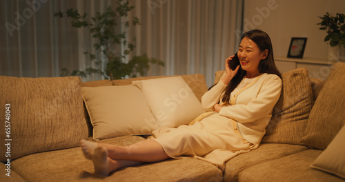 Relaxing on a Couch in the Evening in a Cozy Apartment, Beautiful Smiling South Korean Woman is Having a Funny Phone Conversation with Friend, Sharing Happy Stories About Relationships and Friendship