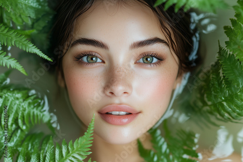 Relaxing Portrait of Young Woman in Bathtub with Fern Leaves