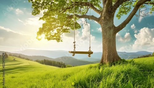 relaxing scene of a old tree in meadow with rope swing hanging from the branches