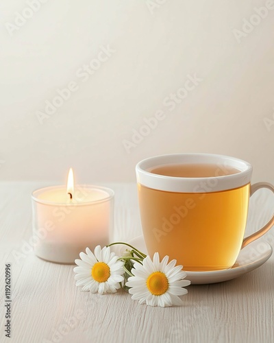 Relaxing Tea Moment with Candle and Daisies Minimalist Setting Cozy Vibe Calm Environment Close-Up View