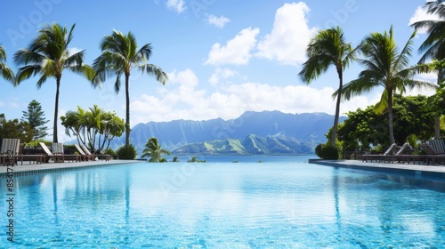 Relaxing Tropical Oasis with Palm Trees and Mountain View Generative AI