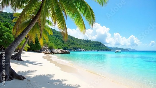 Relaxing tropical scene of a pristine beach with palm trees, clear turquoise water lapping the shore, and smooth, gray tree trunks scattered naturally along the sand , nature, shoreline, coastal