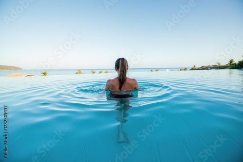 Relaxing Woman in Infinity Pool Overlooking Serene Ocean at Dusk, Capturing Peace and Tranquility of Nature in a Tropical Paradise Setting