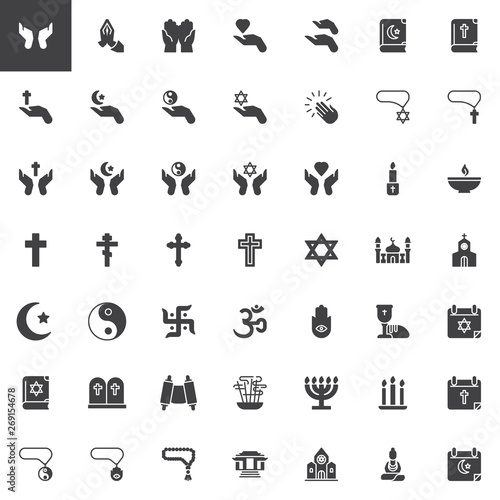 Religion vector icons set, modern solid symbol collection, filled style pictogram pack. Signs, logo illustration. Set includes icons as church building, mosque, synagogue, holy cross, calendar, bible