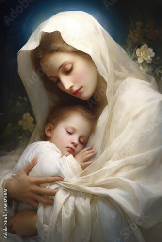 Religious Mother Mary Holding Baby Jesus Christ, Generative AI