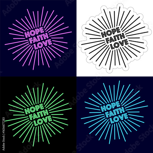 Religious quote icon. Text Hope Faith Love with rays. Multicolor vector Christian message. EPS 10.