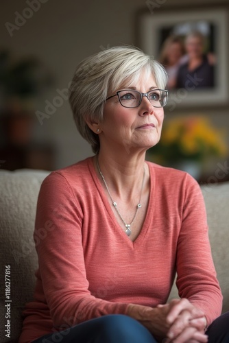 Reminiscing Senior Woman with Warmth Gazing at a Cherished Family Photo on the Wall
