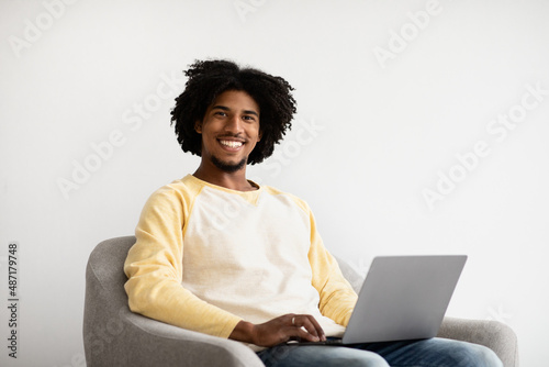 Remote Career. Smiling Black Guy With Laptop Sitting In Armchair At Home