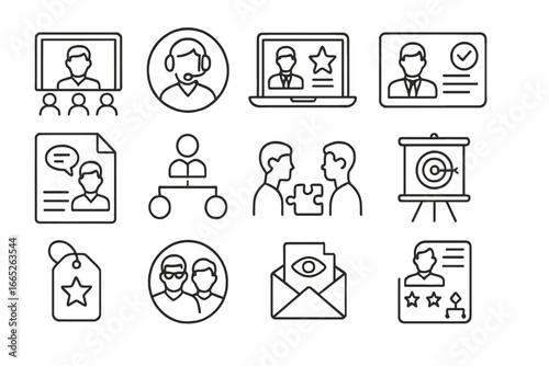 Remote Leadership Icons. Line style icons of remote leadership: virtual manager icon, feedback call badge, digital performance