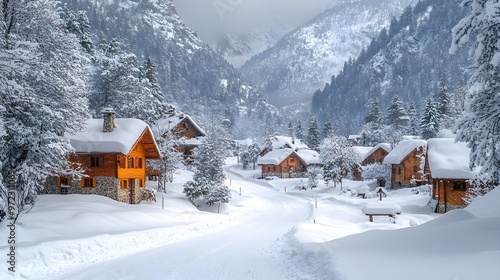 Remote mountain village blanketed in snow, winding paths between houses, gentle snowfall creating a peaceful winter wonderland, soft natural light