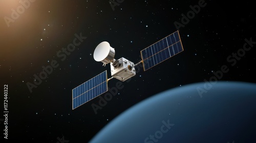 remote sensing satellite technology Concept. A spacecraft with solar panels orbits a distant planet against a starry background.