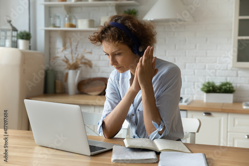 Remote student. Thoughtful serious millennial female in headset sit by laptop focused on video business class webinar. Concentrated young woman listener study internet course from home office online