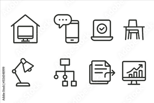 Remote Work Icons. Line style icons of remote work: home monitor icon, chat timeline, daily digital check-in, minimal setup,