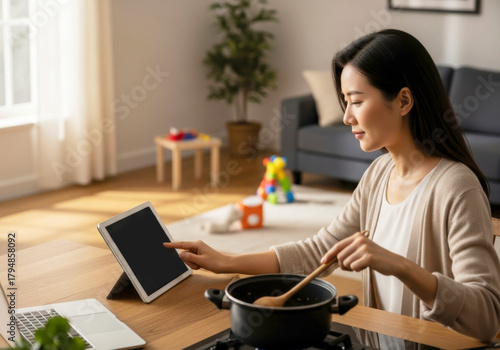 Remote Work Young Chinese Mother Managing Tasks at Home