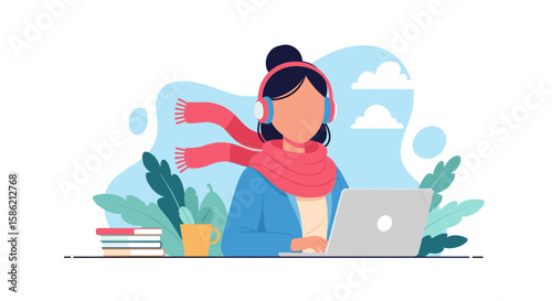 Remote worker woman using laptop at home office, wearing headphones and scarf, work from home concept, landing page design, wfh illustration.