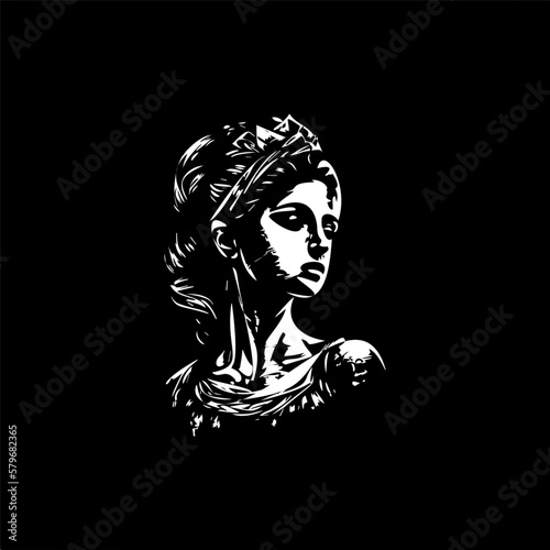 Renaissance girl statue bust dotwork tattoo with dots shading, depth illusion, tippling tattoo. Hand drawing white emblem on black background for body art, sketch monochrome logo. Vector illustration