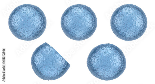 Rendered blue water spheres in different angles showcasing textures against a white background for science visuals