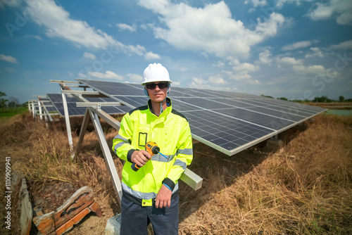 Renewable Energy Eco Technology Electric Power. Worker assemble energy system with solar panel for electricity.(Multiple values)