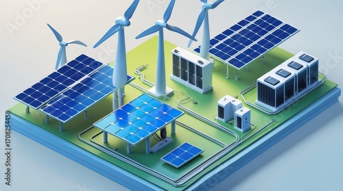 Renewable Energy Illustration: Scene of Sustainable Infrastructure, Solar and Wind Synergy