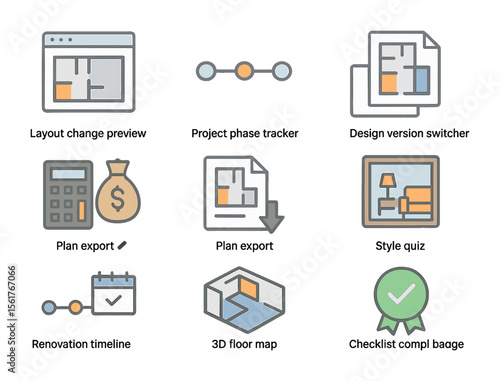 Renovation Aid Icons. Flat icon set of online renovation aid: layout change preview, project phase tracker,