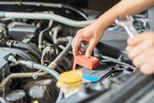 Repair and service. Mechanic open vehicle hood checking up auto mobile.
