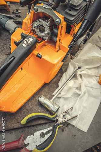 Repair chainsaws at home, parts and pliers on the table.
