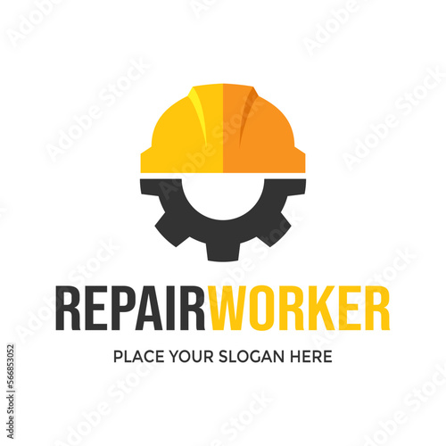 Repair or Construction Worker vector logo template. This design use gear and helmet symbol.