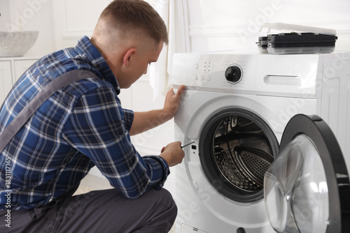Repairman in uniform fixing broken washing machine with screwdriver at home
