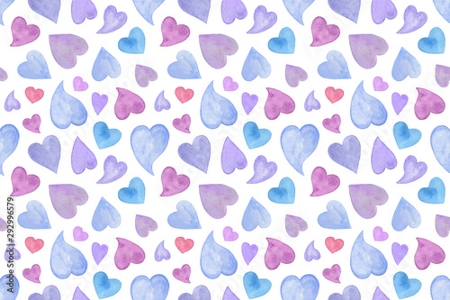 Repeat pattern of blue and violet hearts of different sizes, ornament for St Valentine holiday celebrations