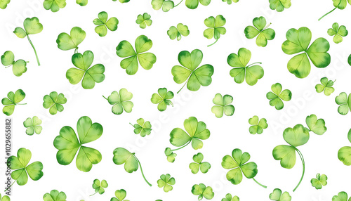 repeat pattern of hand drawn watercolor green shamrock leaves isolated with white highlights, png