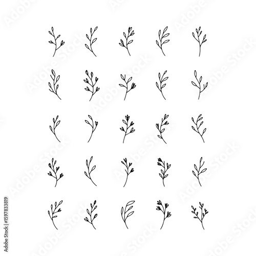Repeating Botanical Pattern Set. A collection of repeated hand-drawn twigs and leaves arranged in neat grids, ideal for seamless patterns and textile design.
