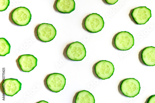 repeating pattern of sliced semicircles of fresh raw vegetable cucumbers for salad isolated on a white background flat lay, top view