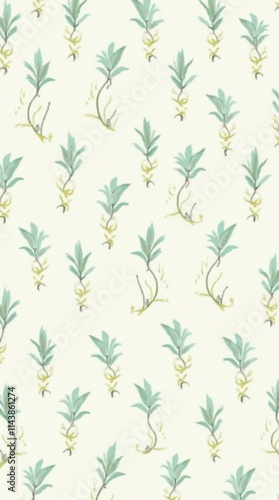 Repeating Pattern of Stylized Leaves in Green, Blue, and Yellow