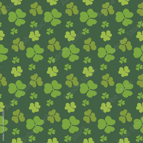 Repeating seamless pattern with green shamrock clover leaves on dark green background. Perfect for St. Patrick’s Day, nature-themed designs, fabric, wrapping paper, and digital backgrounds.