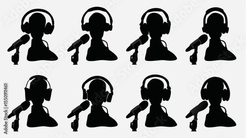 Repeating silhouettes of podcast hosts with headphones and microphones on a white background pattern