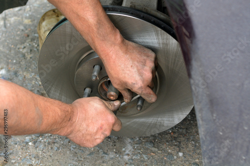 Replacement of worn disc brake system of the car. The mechanic carries out maintenance of brakes. Garage repair of the car.