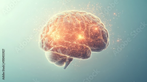 representation of a human brain formed by interconnected particles and glowing lines, floating against a clean white background,